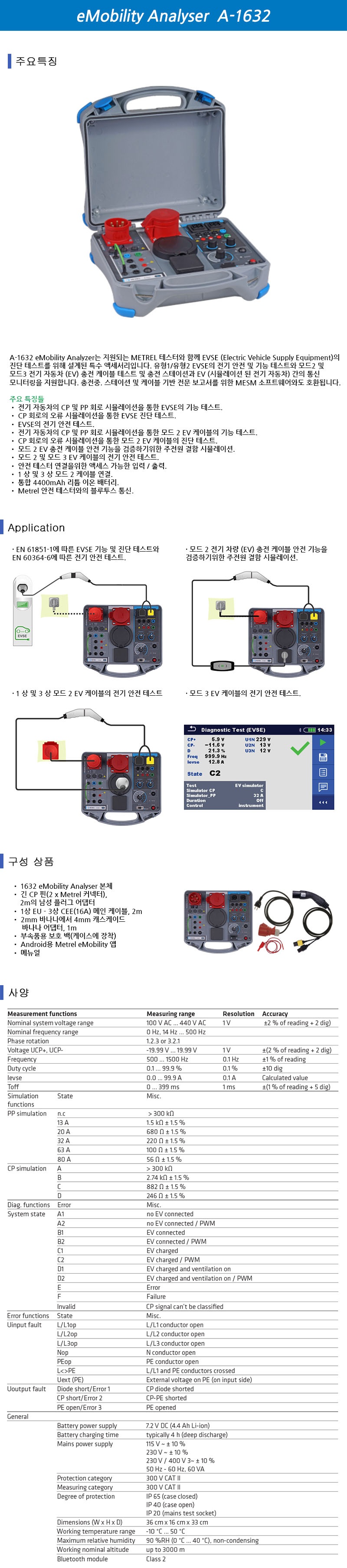 Type 1 및/또는 Type 2 EVSE의 전기안전 및 기능 테스트 검증과 모드 2 및 모드 3 전기 자동차(EV) 충전 케이블 테스트 장 A-1632 eMobility Analyser
