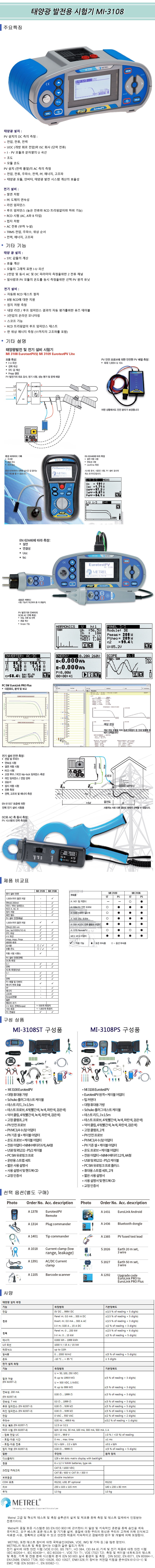 PV U/I곡선,일사량,온도, AC/DC전압및전류,PV패널DC전력 및 인버터전력측정,주파수 EUROTEST PV LITE MI-3108