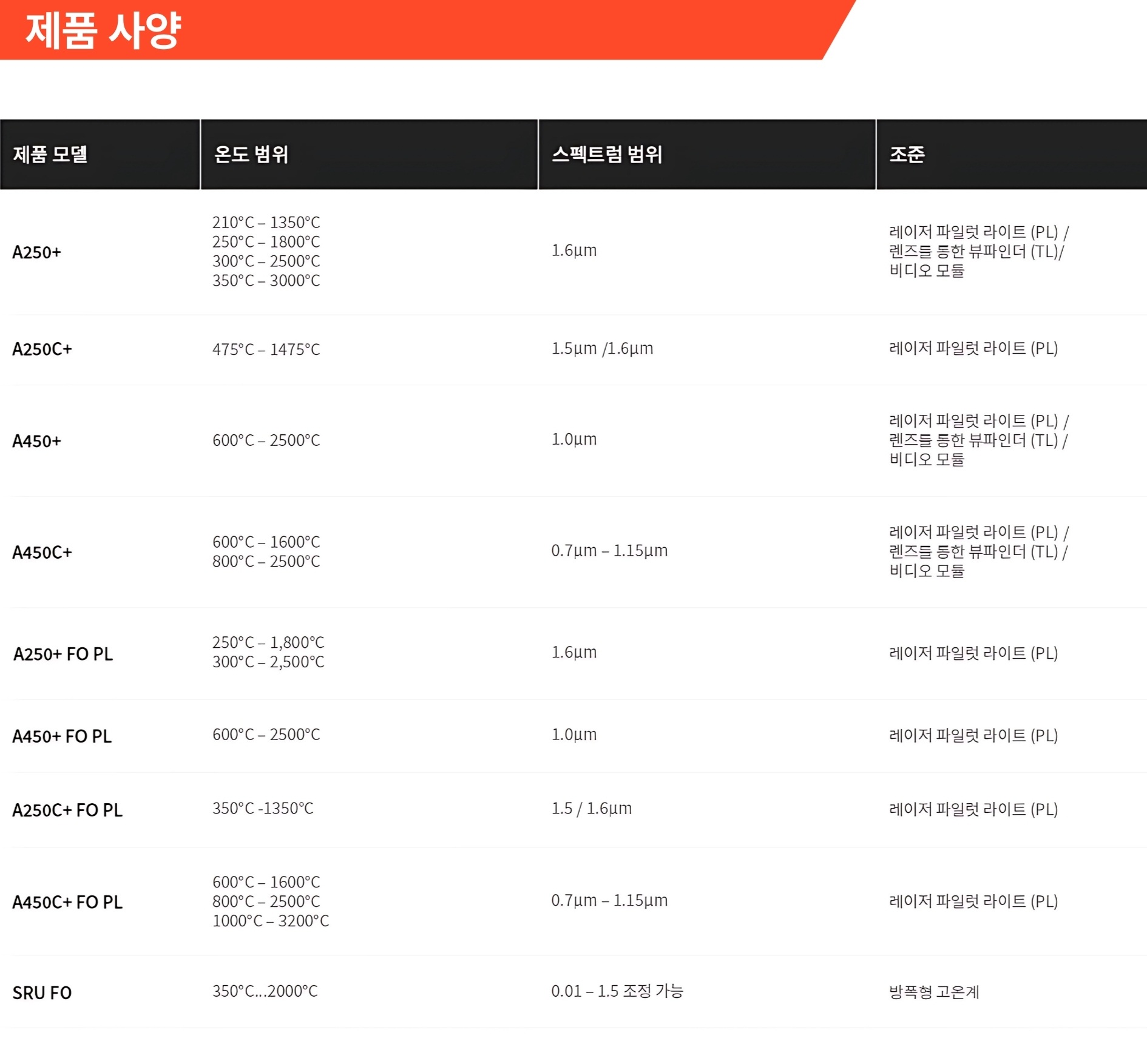 A1. A250+ FO PL은 250°C ~ 2500°C의 온도 범위를 지원하며, 1.6μm의 파장 범위를 가집니다. 반면 A450+ FO PL은 600°C ~ 3200°C까지 측정 가능하며, 0.7μm ~ 1.15μm의 파장 범위를 가집니다. 즉, A450+ FO PL은 더 높은 온도에서 정밀한 측정을 수행할 수 있습니다.