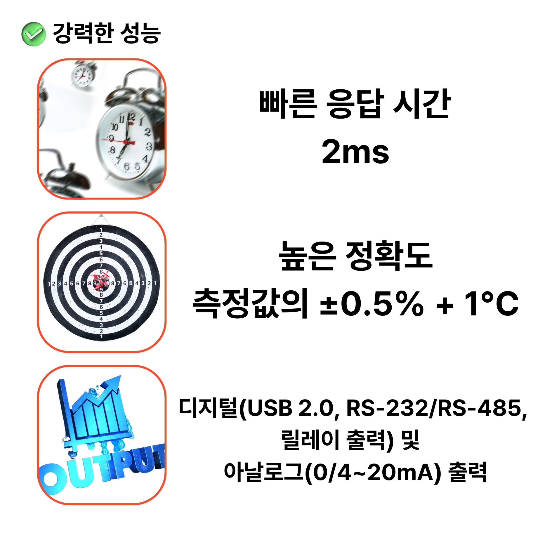 | 정확도 | ±0.5%측정값±2°C | ±0.3%측정값+1°C | ±0.3%측정값+1°C | ±0.5%측정값+1°C |