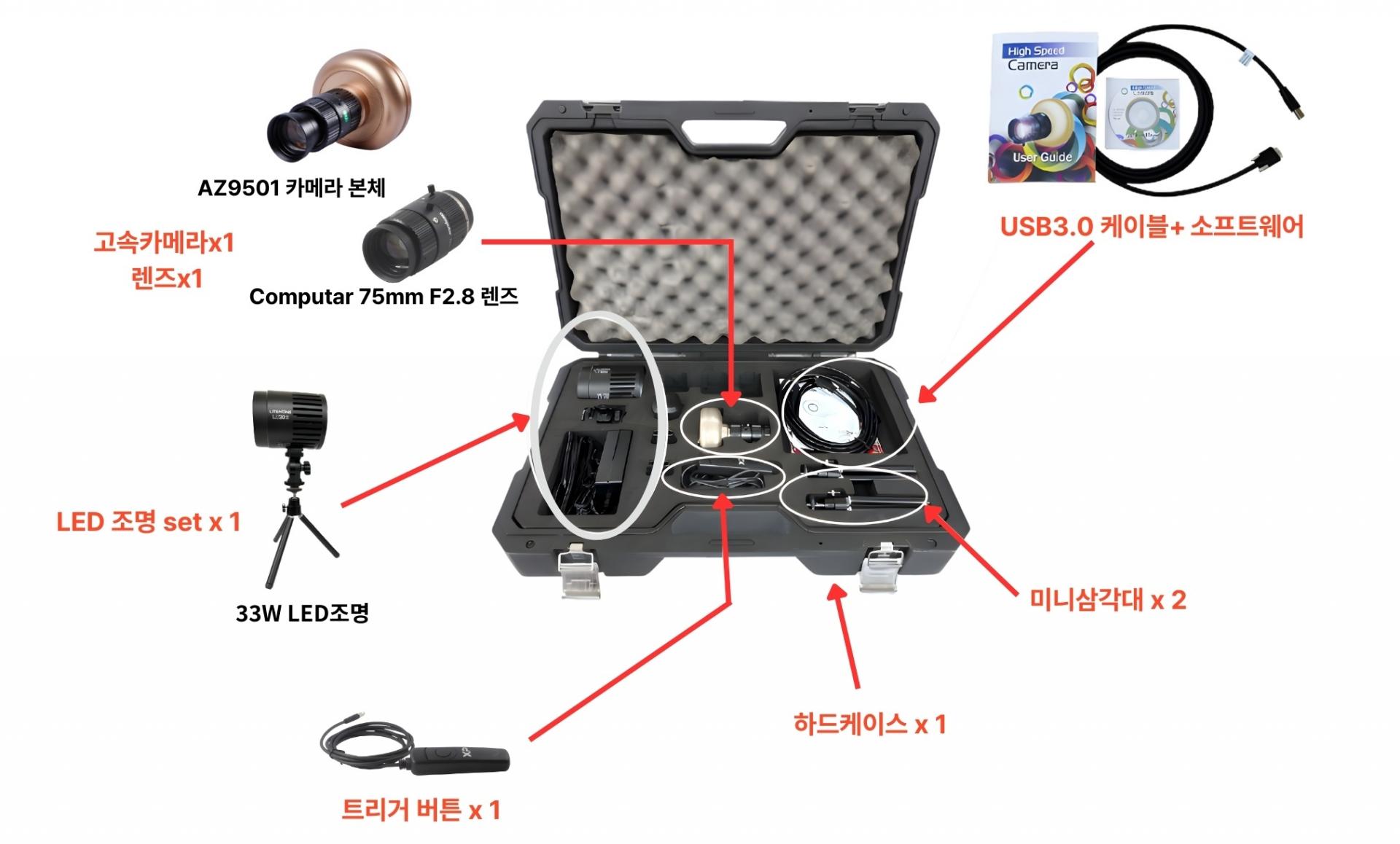 ![]() | 카메라 + 렌즈 + 조명 + USB 케이블 + 트리거 + 삼각대 ×2 + 하드케이스가 모두 포함된 풀패키지 |