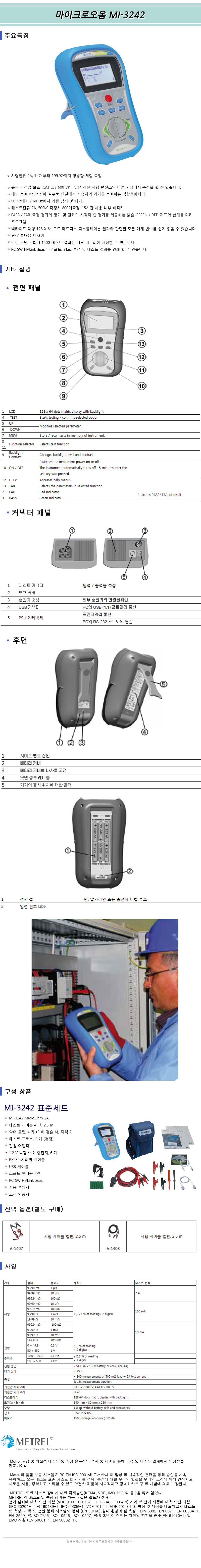 시험전류10mA~2A(1 μΩ ~ 199,9 Ω),주파수측정.USB,RS232,PC SW HVLink PRO소프트웨어포함 MI-3242 MicroOhm 2A