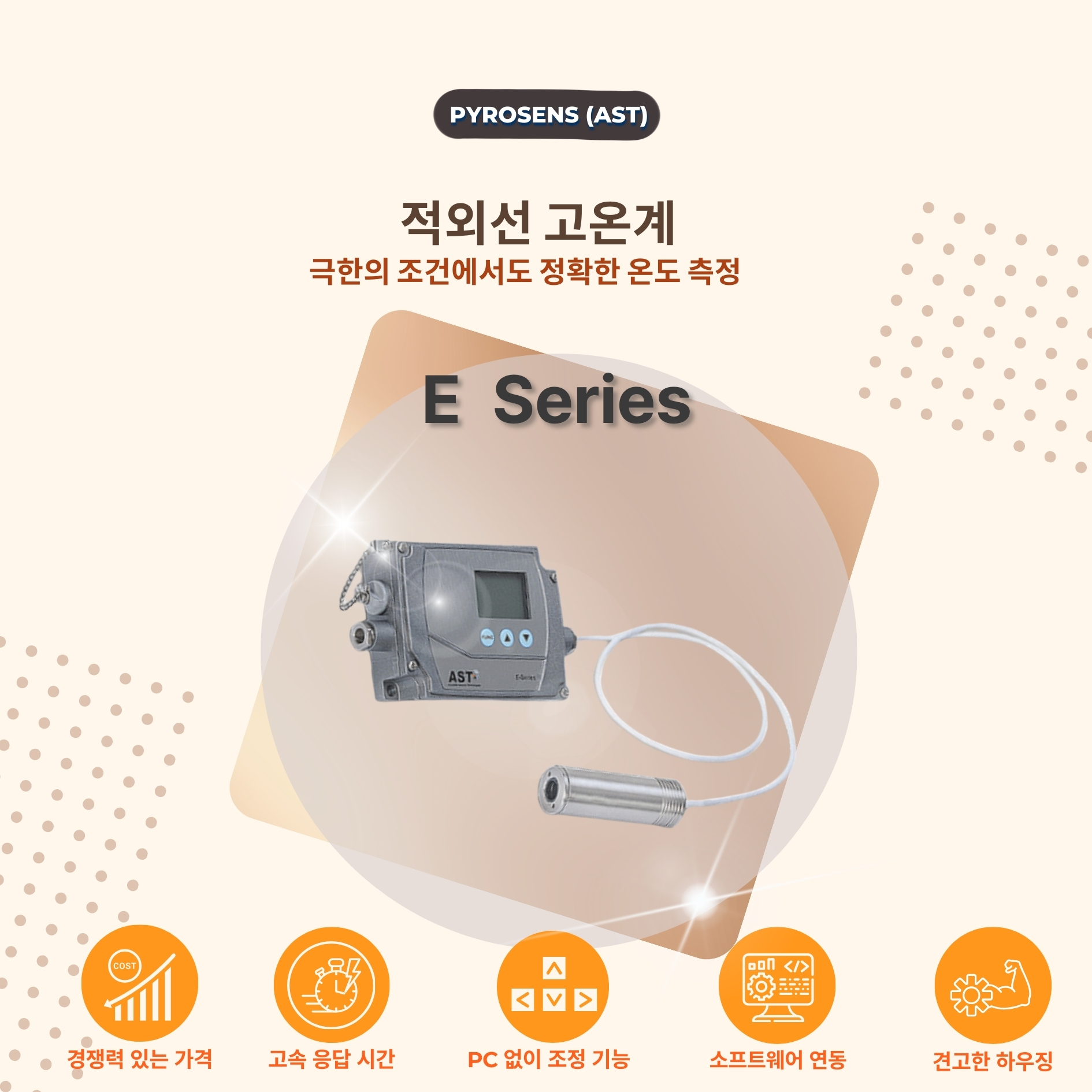 | 특징 | 아날로그출력,디지털인터페이스, USB2.0,릴레이출력,내장OLED 디스플레이, 파라미터설정키및 레이저조준기포함의단파장 IR온도계,금속·흑연·세라믹표면의 비접촉온도측정에적합 | 아날로그출력,디지털인터페이스, USB2.0,릴레이출력, 내장OLED 디스플레이, 파라미터설정키및 레이저조준기포함의단파장 IR온도계, 고온금속표면의 정밀측정에적합 | 고정식 설치에 적합한 고정밀 단파장IR온도계,금속 및 기타 고온 물체측정용, OLED디스플레이, 아날로그및디지털출력, USB2.0, 레이저조준기포함 | 고정식설치에적합한고정밀 2색IR온도계,연기·먼지·열간공정 환경등에서 높은정확도로 온도측정, OLED디스플레이, 아날로그및디지털출력, USB2.0, 레이저조준기포함 |