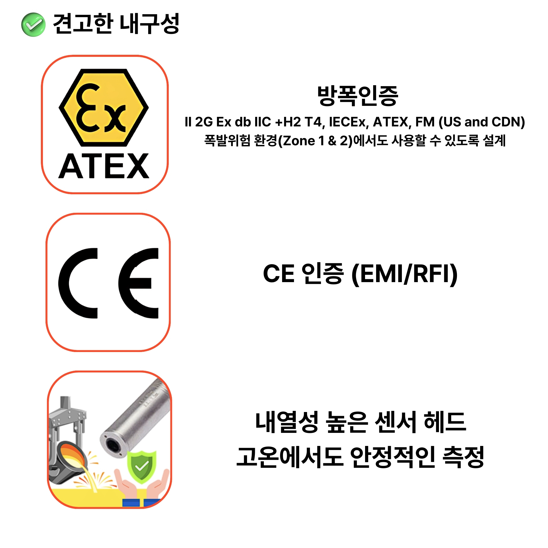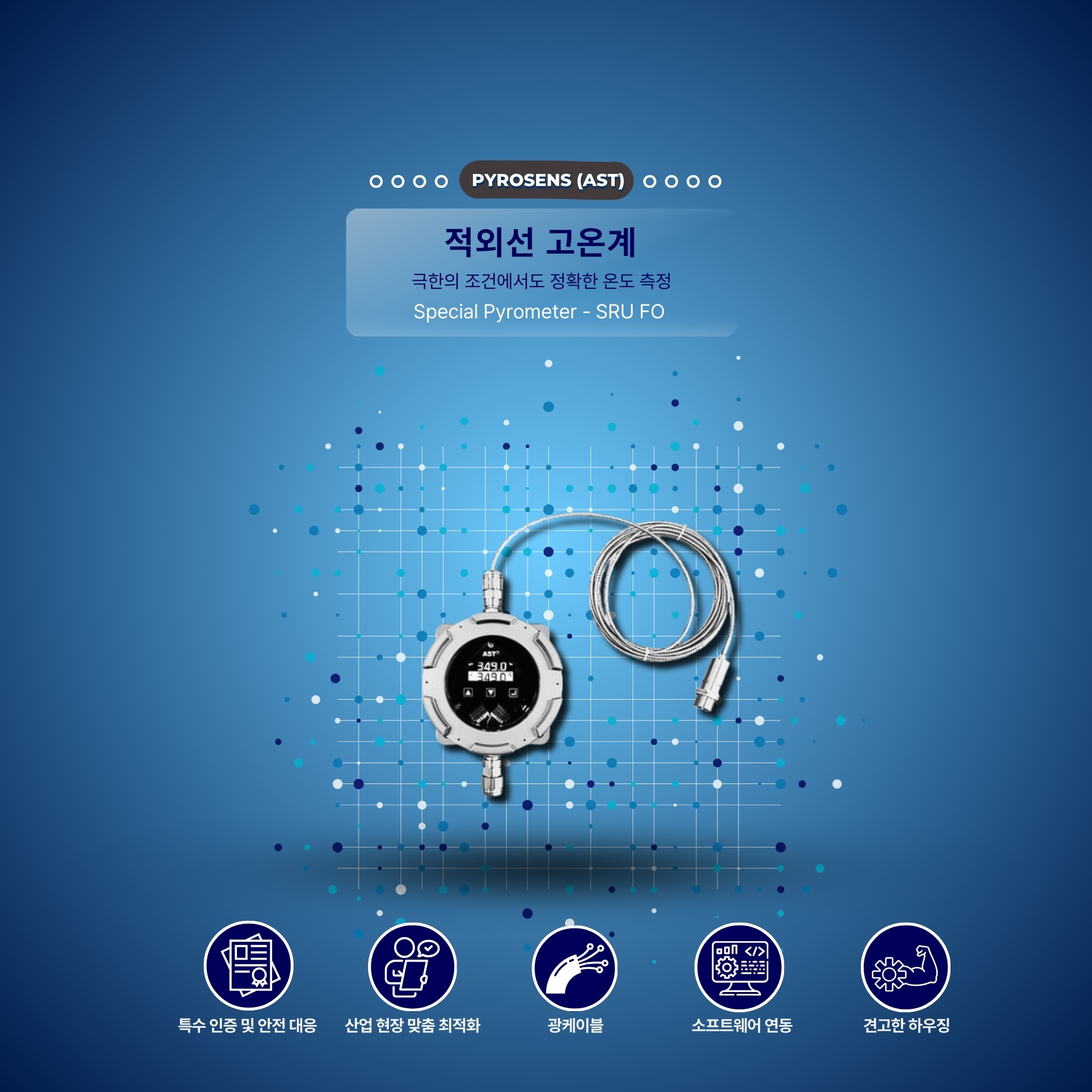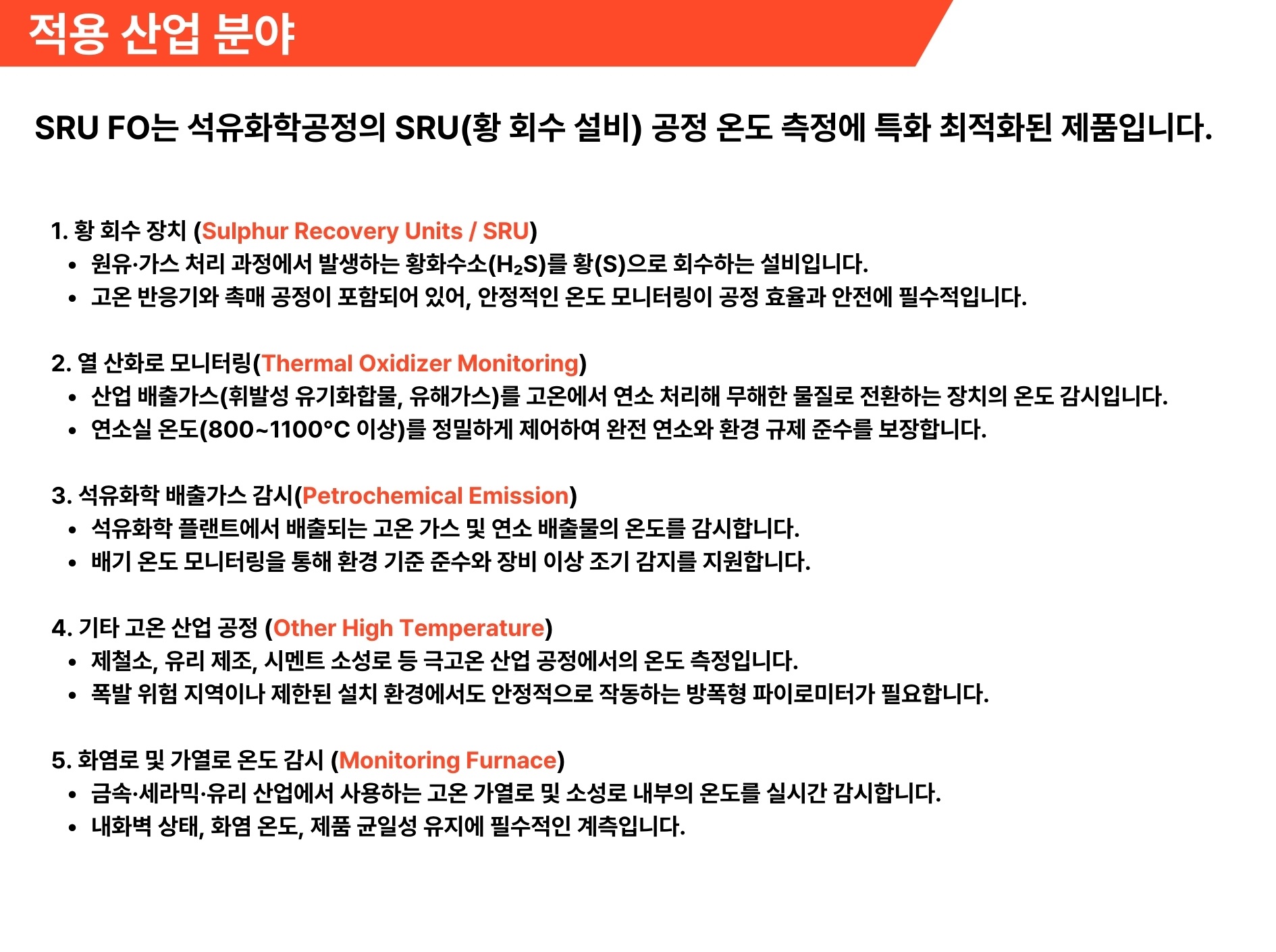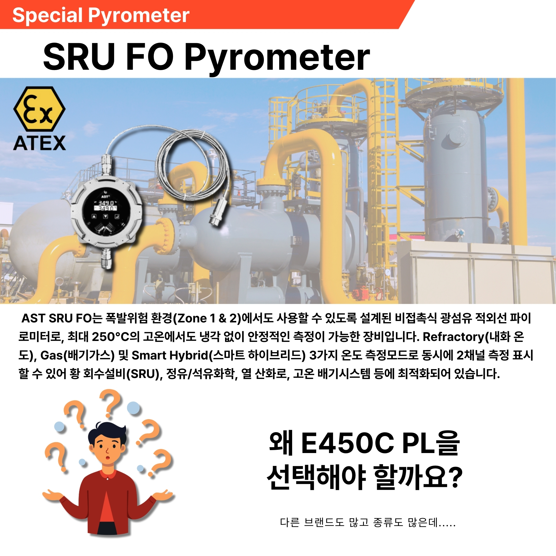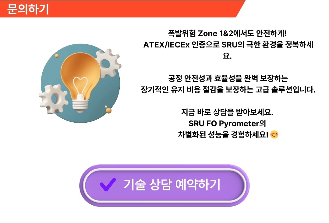 A1. SRU-FO는 ATEX 인증을 받은 방폭형 적외선 파이로미터로, 석유화학·정유·가스·제철 등 폭발 위험이 있는 고온 환경에서 안전하게 사용됩니다.