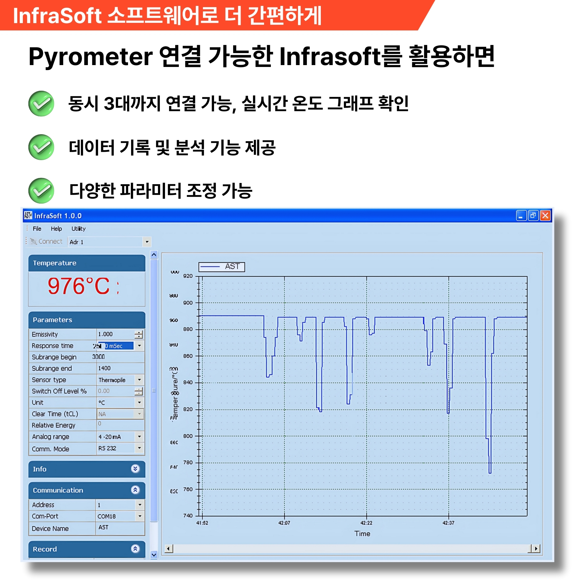 A6. AST InfraSoft 소프트웨어를 사용하면 최대 3대까지 동시에 연결해 실시간 그래프, 데이터 로깅, 분석이 가능합니다.