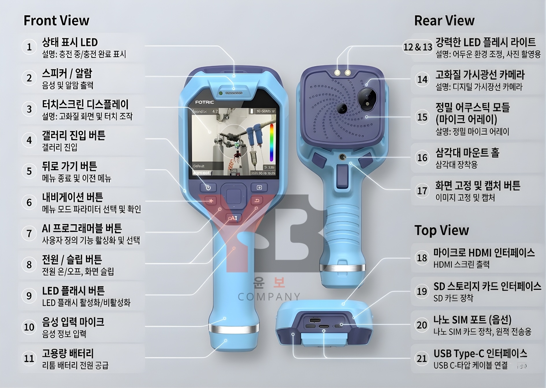 ![]() | 단일 배터리 기준 연속 사용 시간은 4시간 이상이며, 배터리는 교체형입니다. 또한 장비 보호 등급은 IP54로, 다양한 산업 현장에서 휴대하며 점검하기에 적합합니다. |