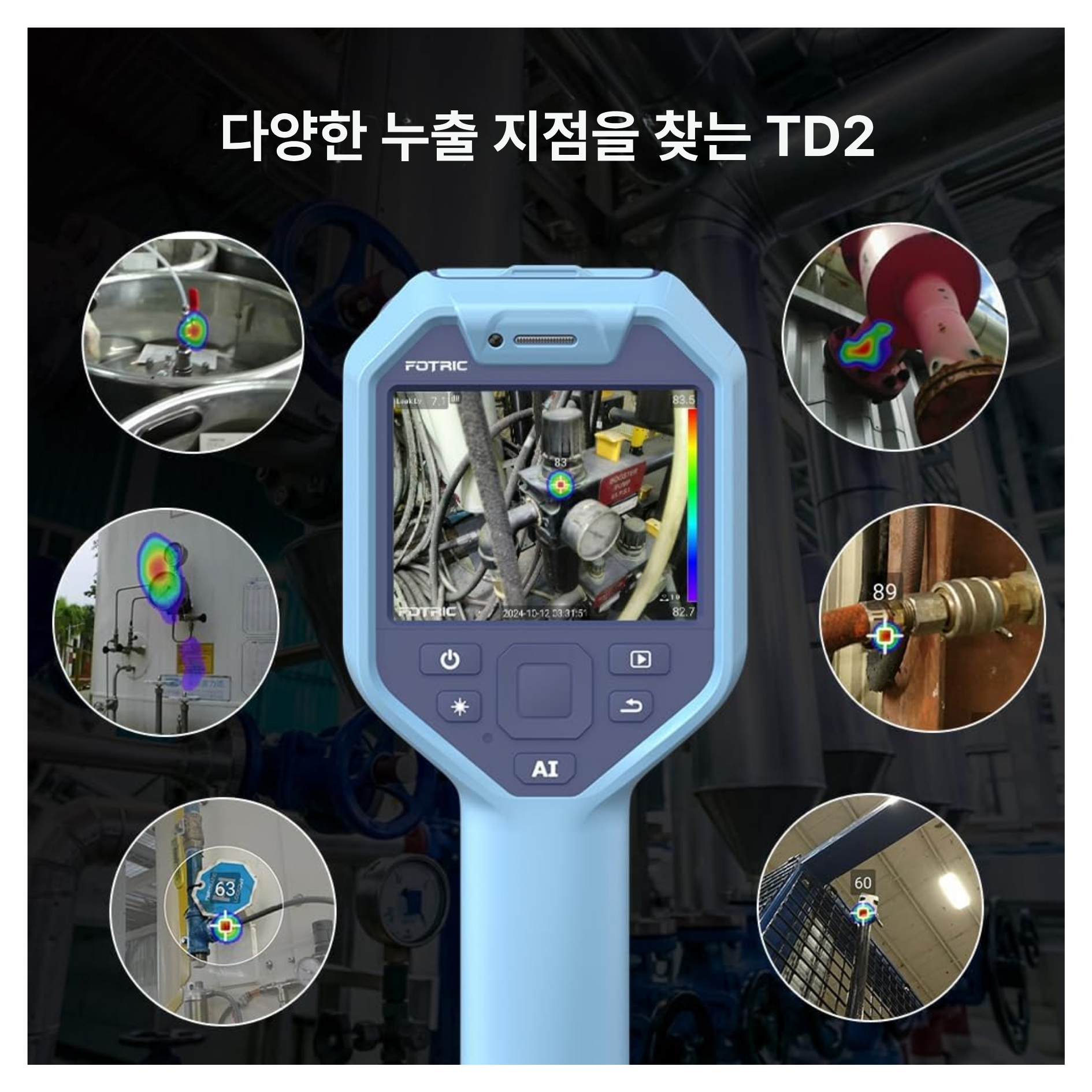 | • 비눗물 없이도 누설 지점을 빠르게 시각화할 수 있어 자동차, 유지보수, 검수 작업 등에서 보다 효율적인 점검이 가능합니다. |